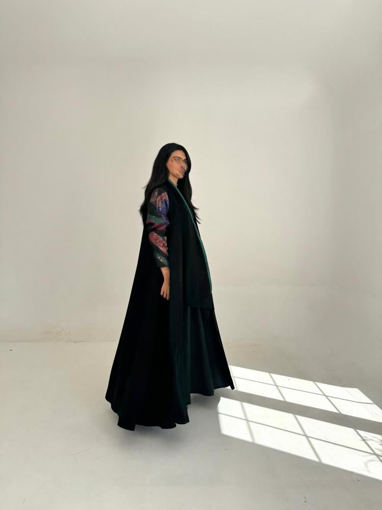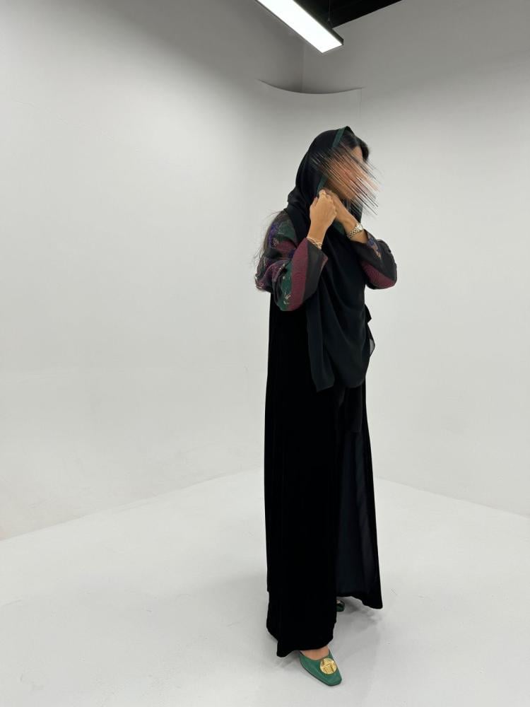 عبايه كريب اسود ، الاكمام اورقنزا تركي مرسم بقطع اقمشه مختلفه مبطن بشيفون وطرحه طرف ، القصه كلوش ..