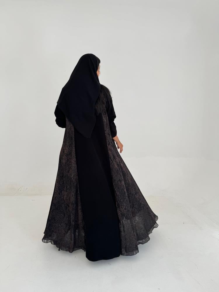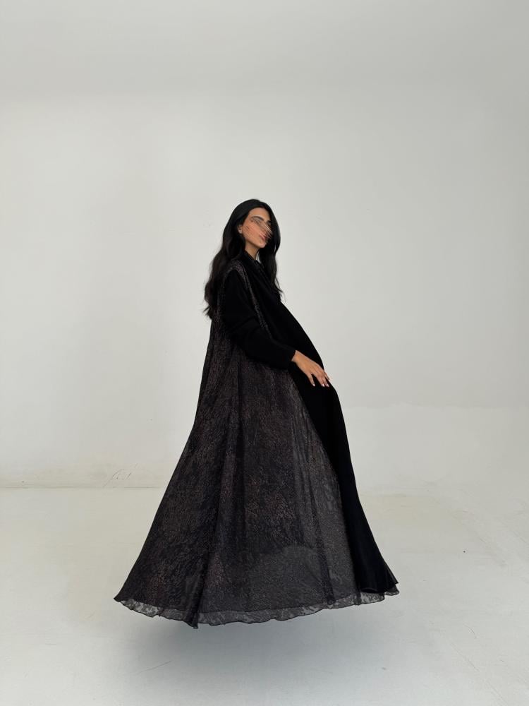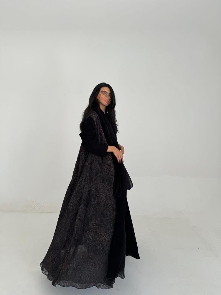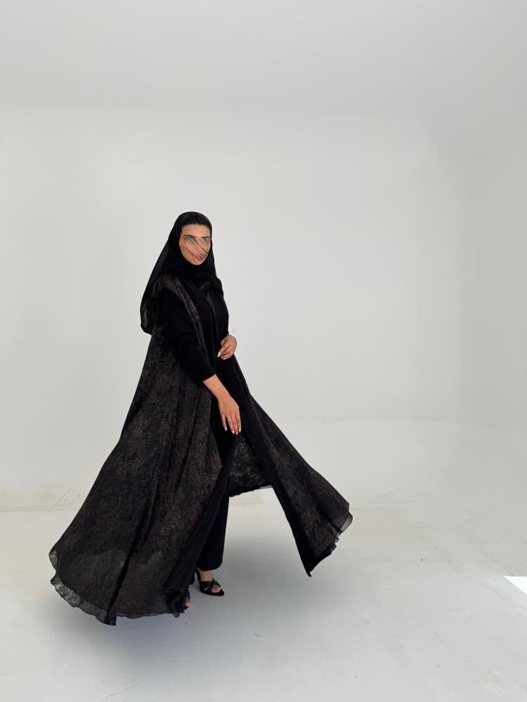 عبايه كريب اسود ، شيفون مشجر مبطن بشيفون اسود ، طرحه اسود طرف ، القصه كلوش …