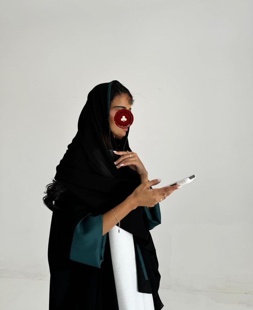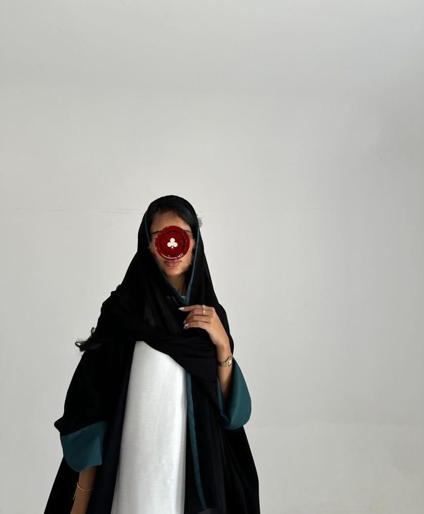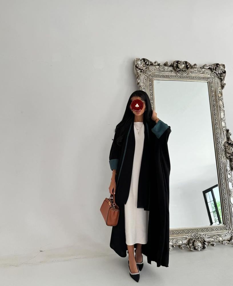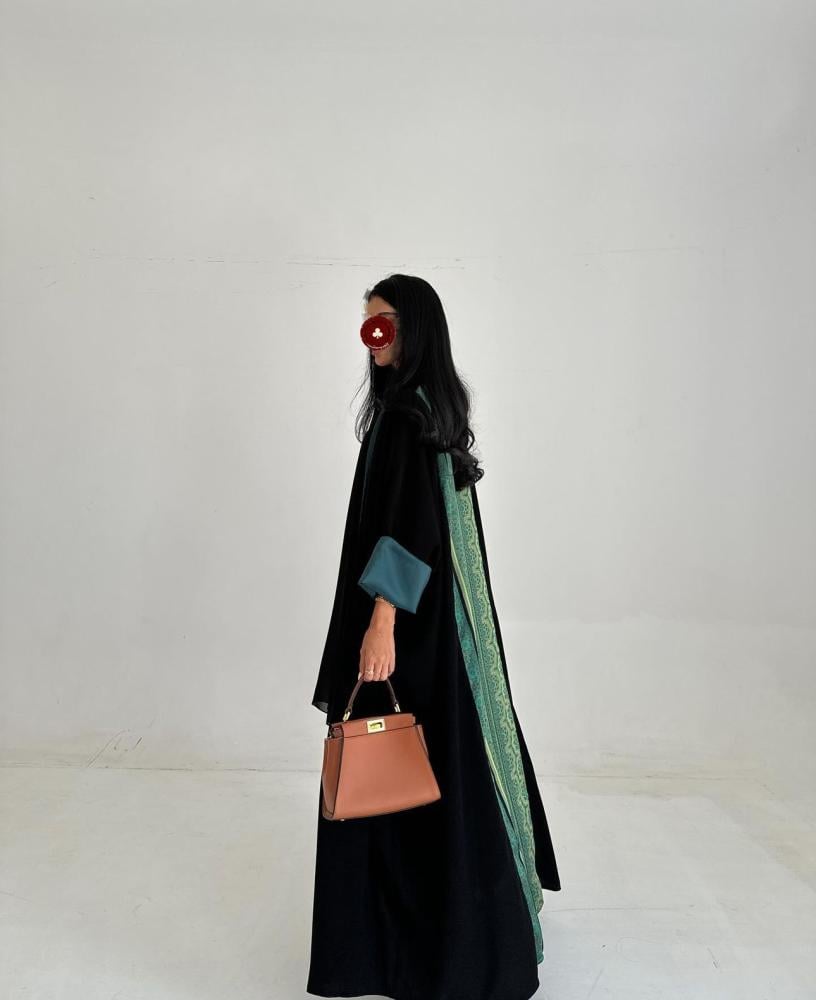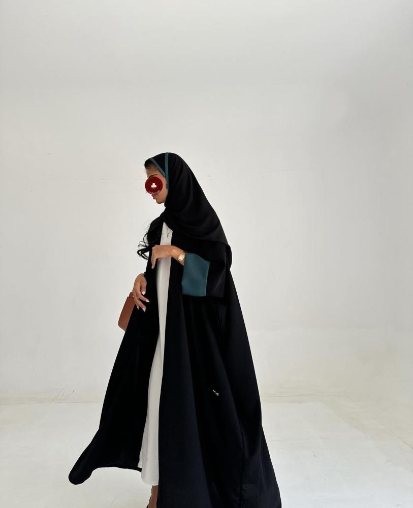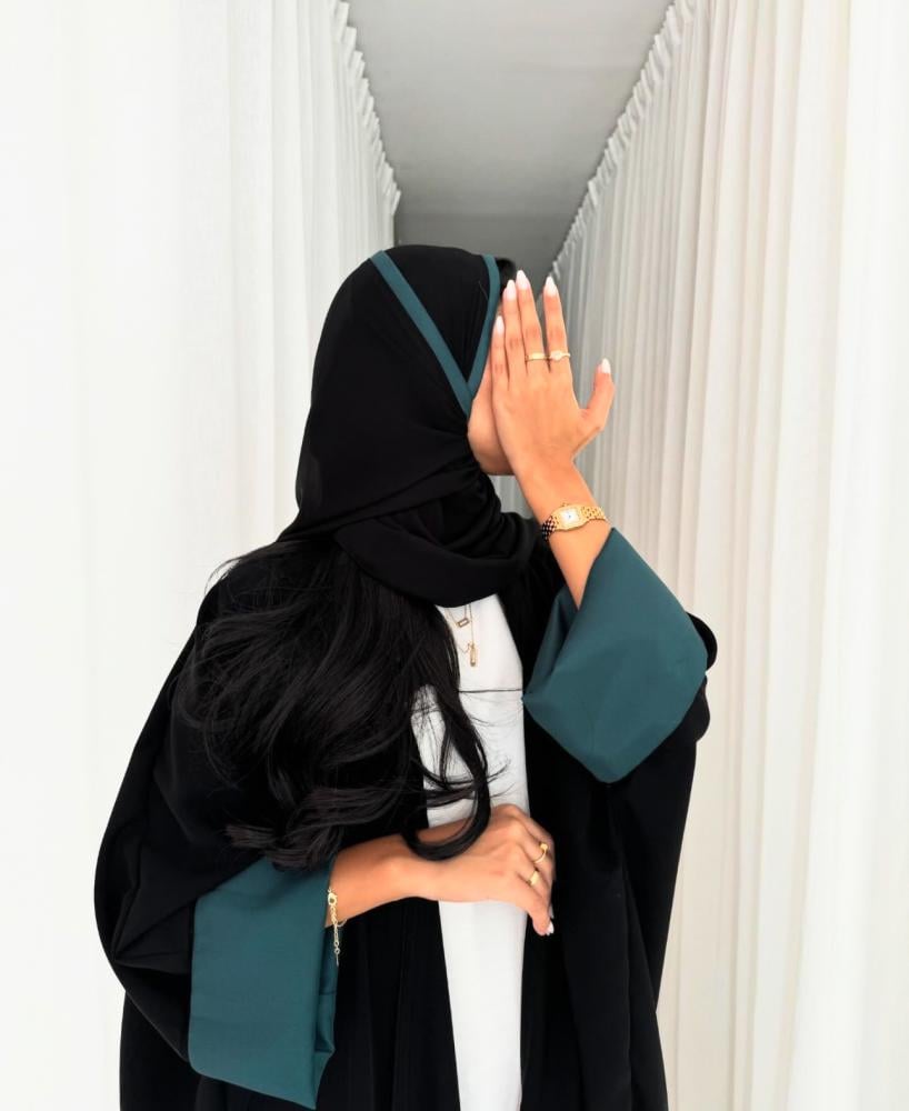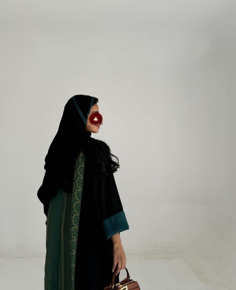 عبايه كريب اسود ، تفته فرنسي فاخر مشجر من الخلف ، اكمام تفته اخضر غامق ، طرحه طرف تفته اخضر ، القصه بشت ..