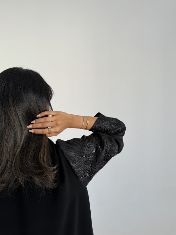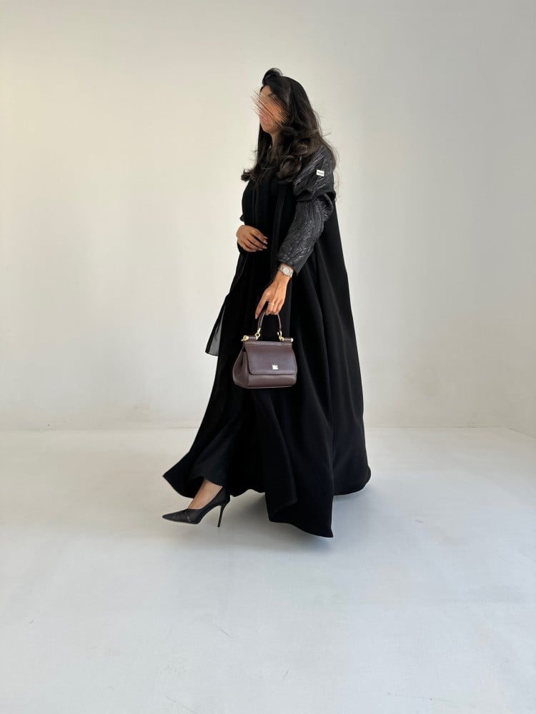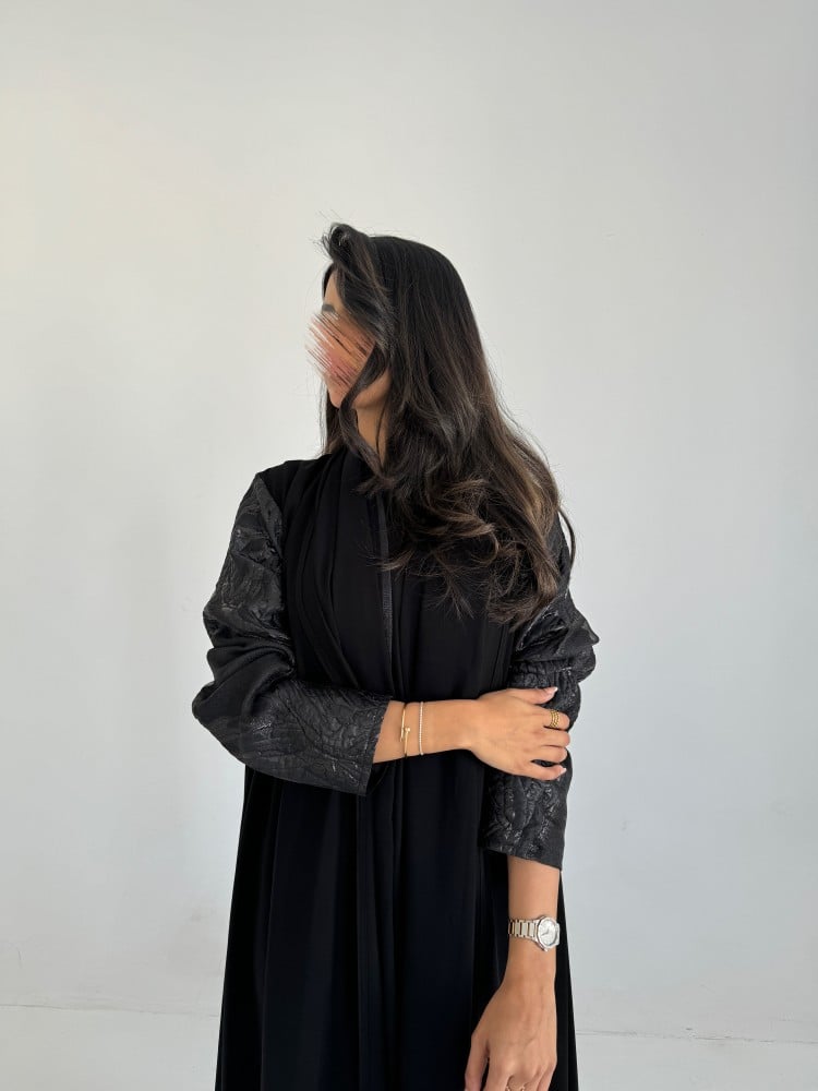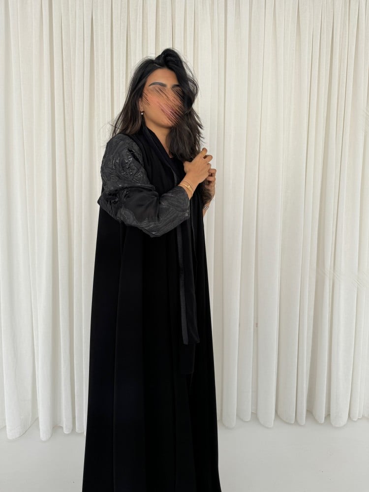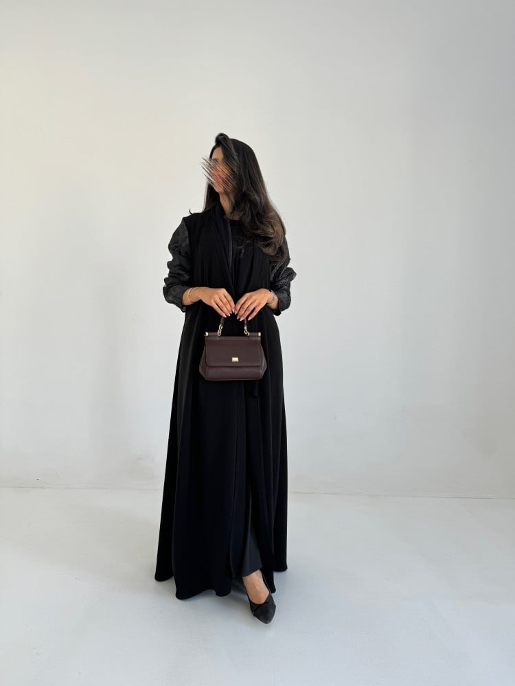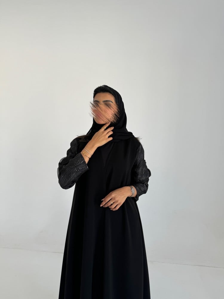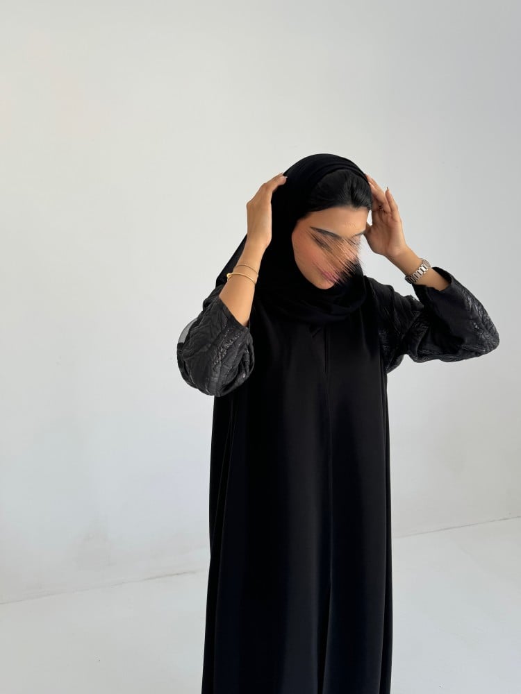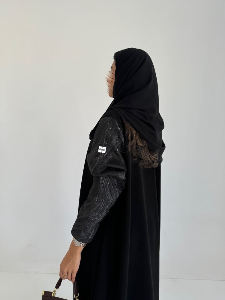 عباية قماش كريب اسود ، قماش تركي مرسم بقطع اقمشة مختلفة مبطن بشيفون ، القصة نص كلوش ، الطرحة اسود طرف