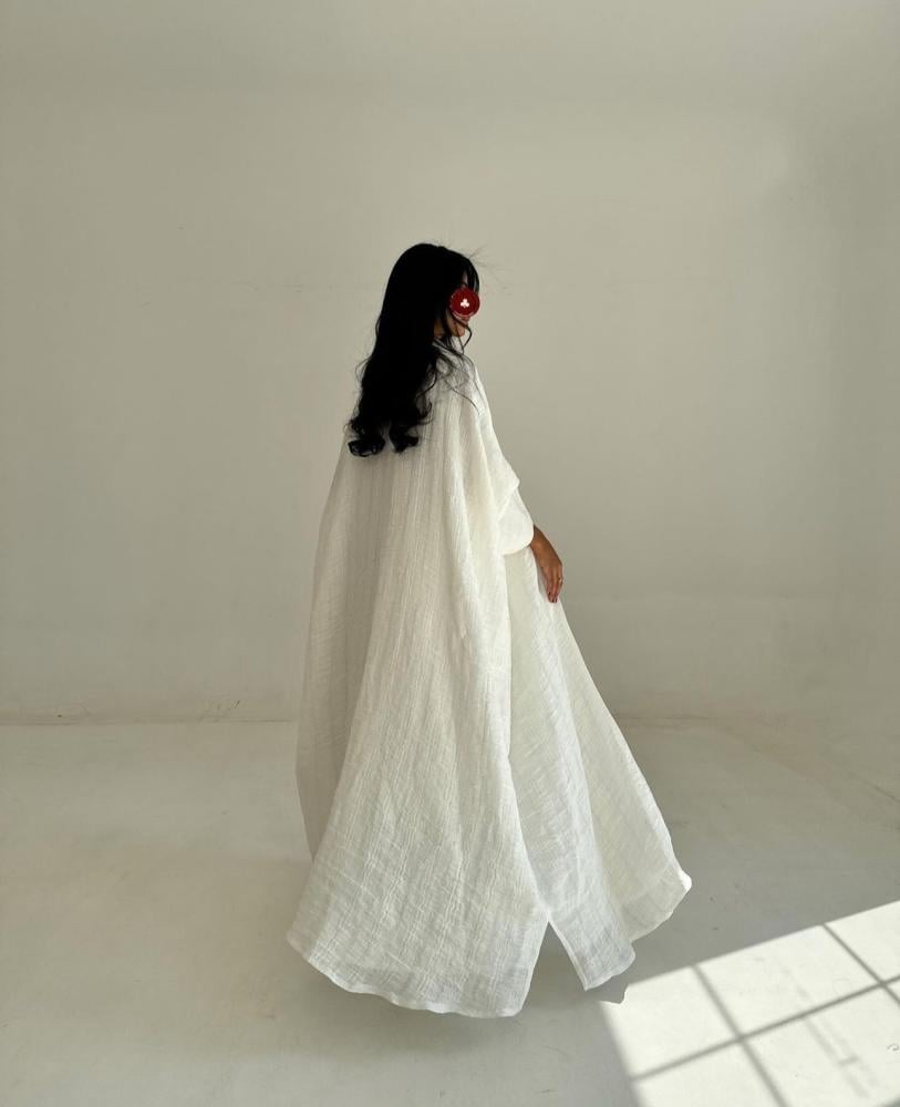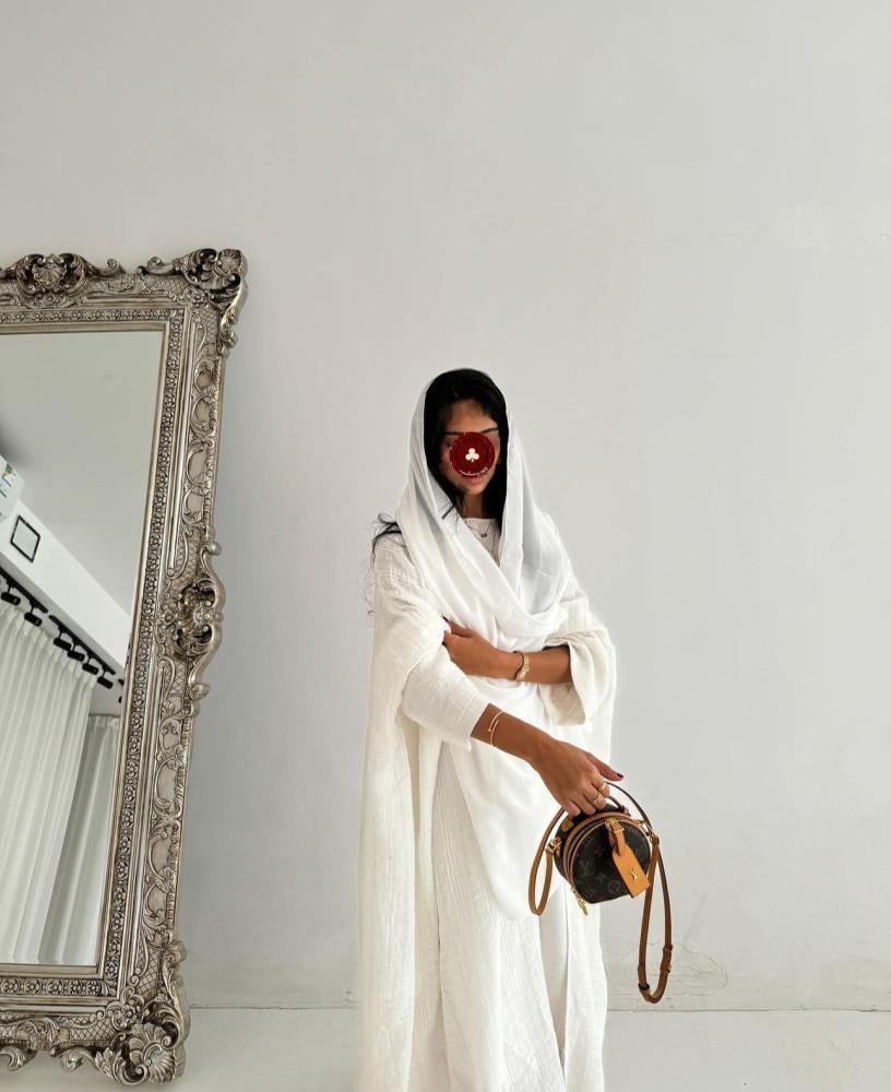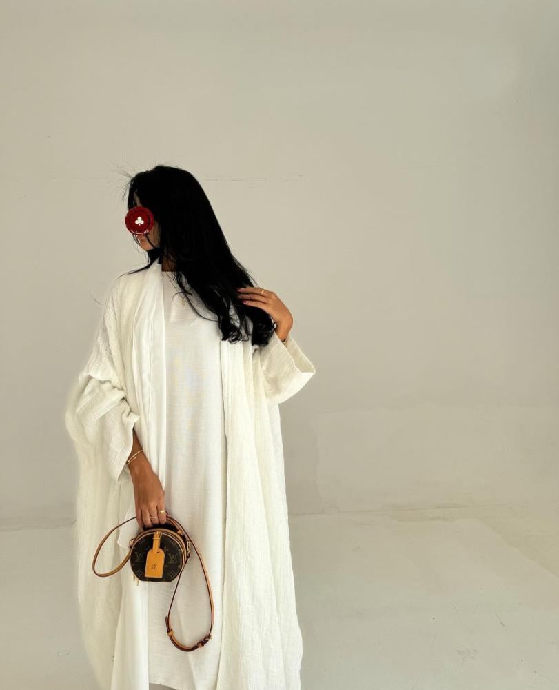 عباية قماش لينن ، بطانه شيفون ، قصة بشت، طرحه شيفون ابيض .