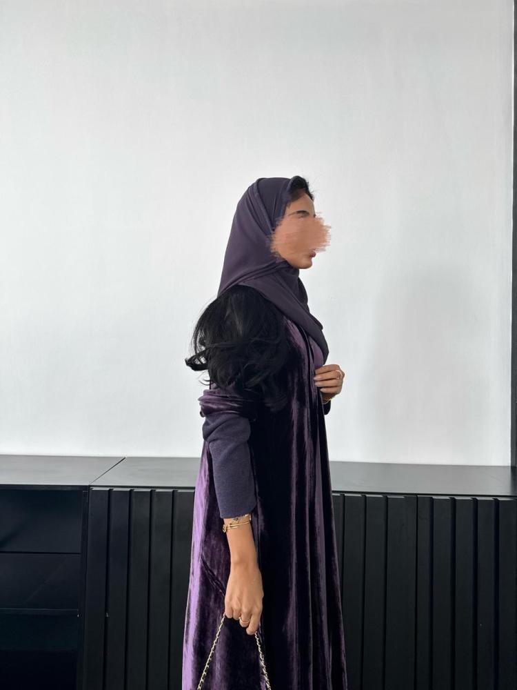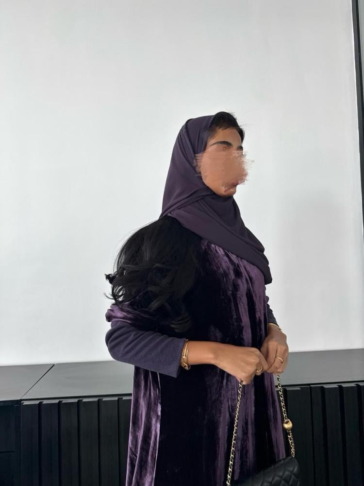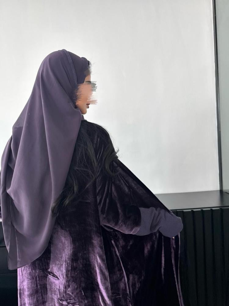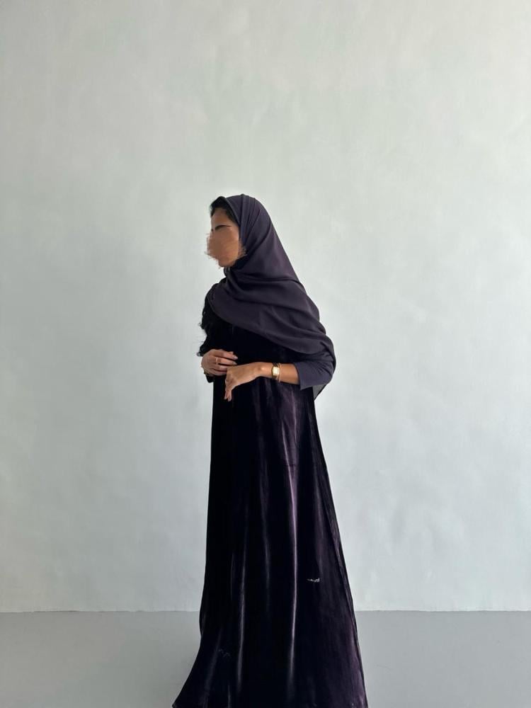 عباية قماش مخمل حرير فرنسي ، اكمام صوف تركي فتحة اصبع، القصة كلوش ، طرحه طرف صوف