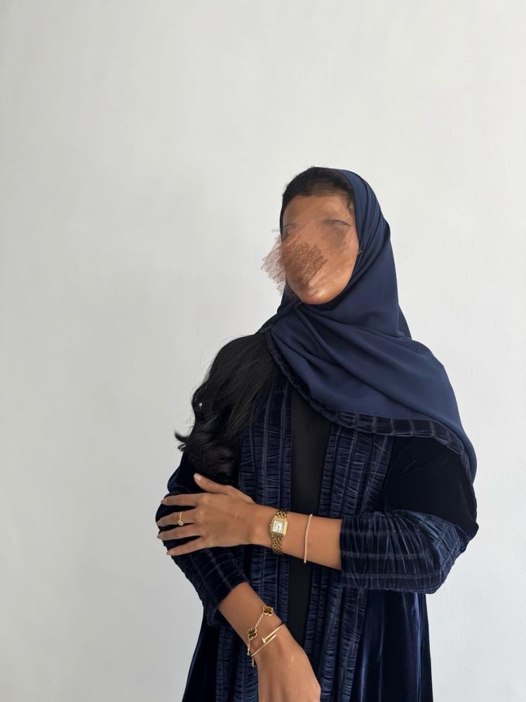 عباية قماش مخمل ياباني كحلي ساده ، تدخيلات مخمل جاكار مكسر ، القصة نص كلوش ، طرحه طرف مخمل جاكار