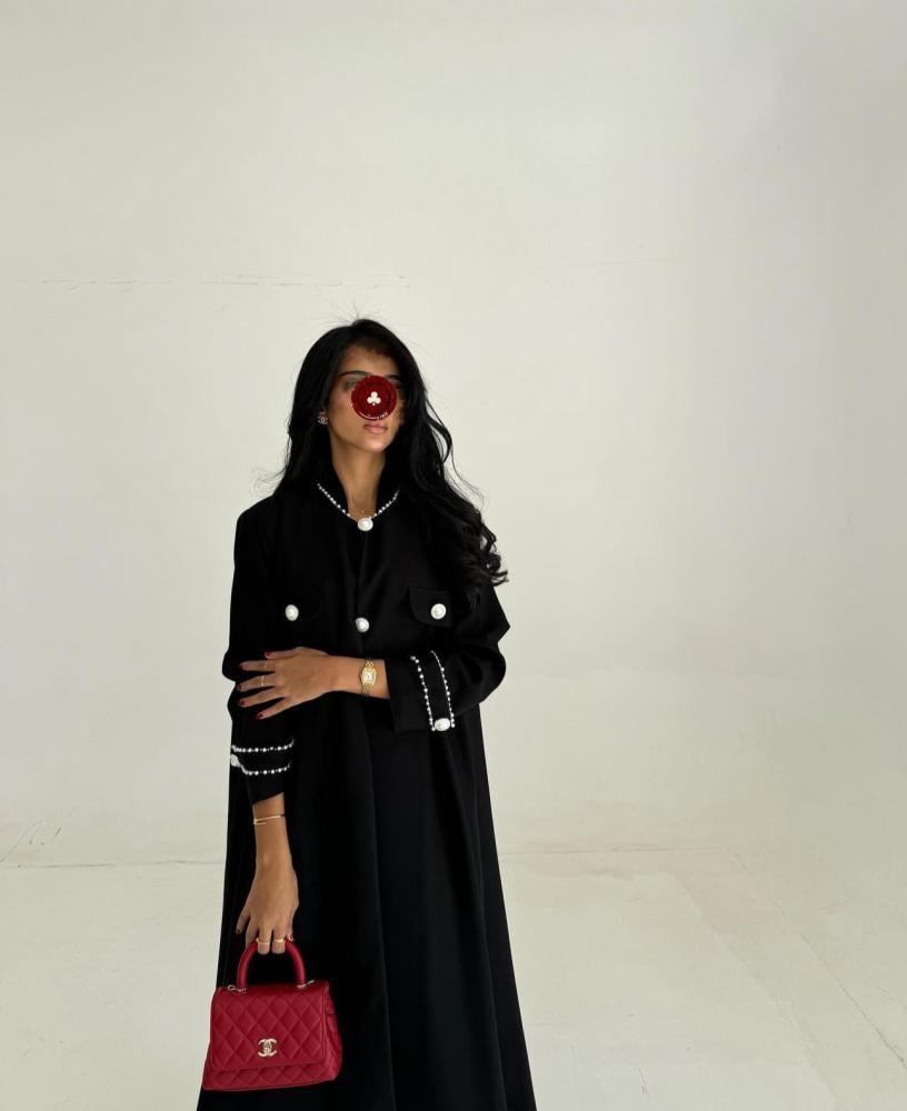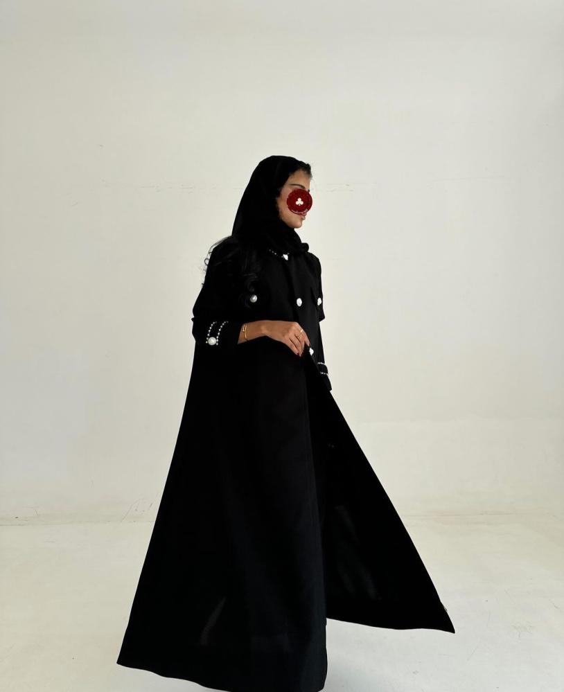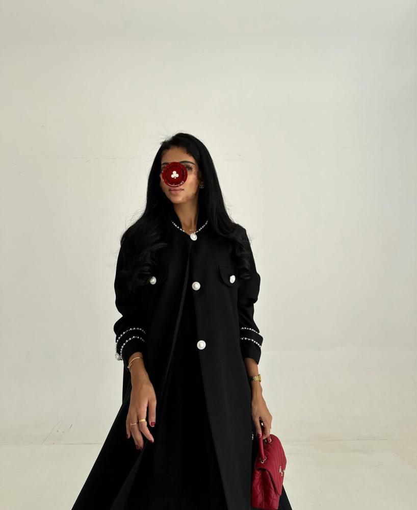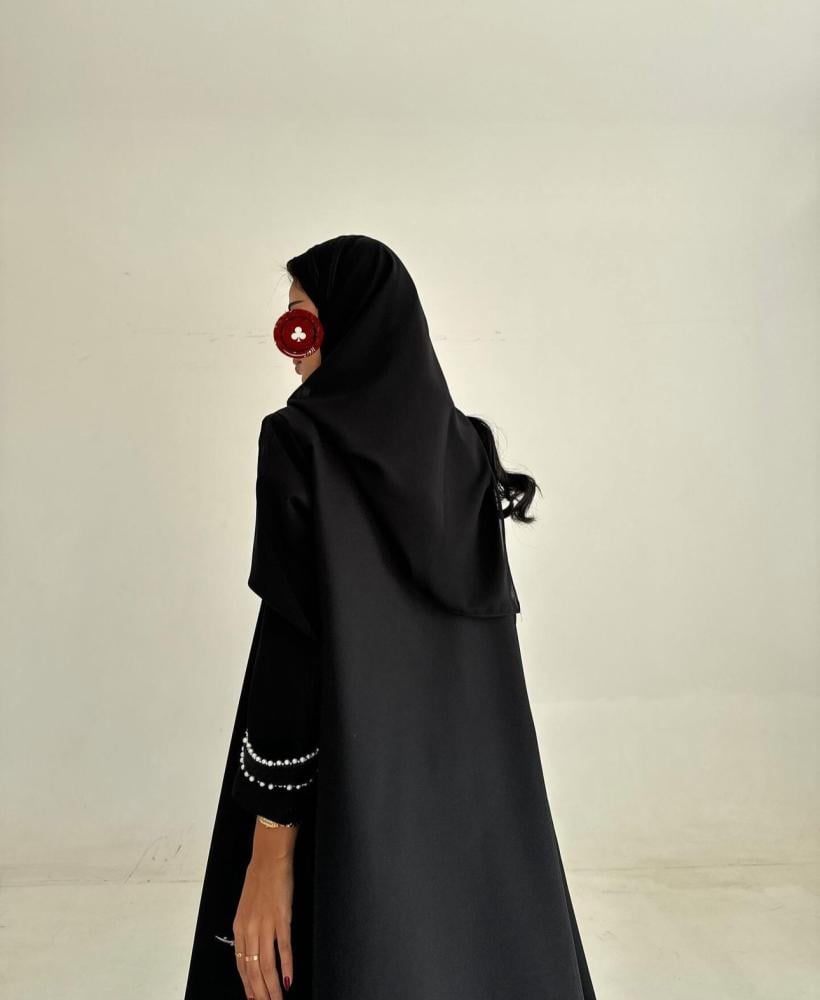 عباية قماش كتان اسود لولو خياطه يدويه في الرقبه والاكمام ، قصة كلوش ، ازرار لولو ، طرحه ساده .
