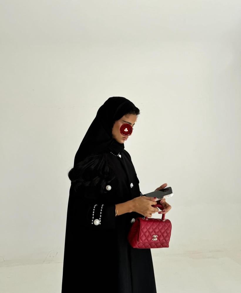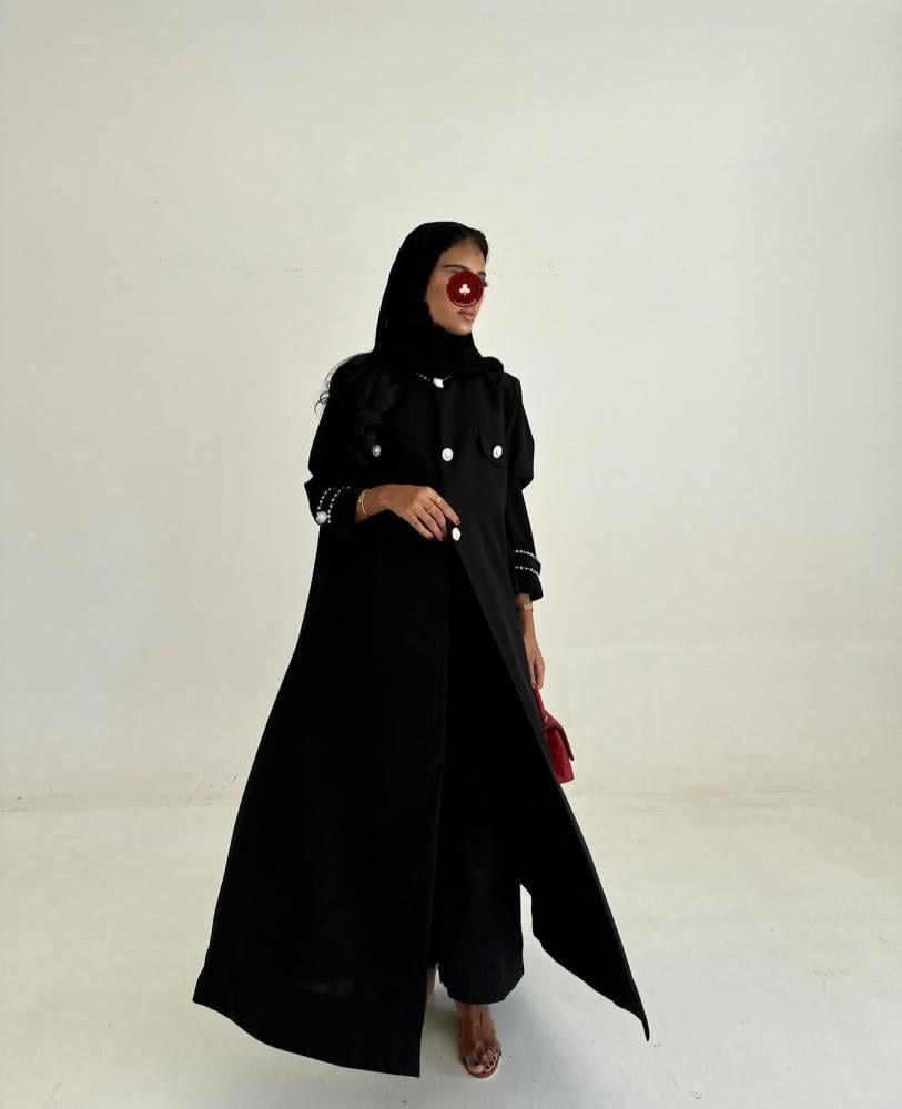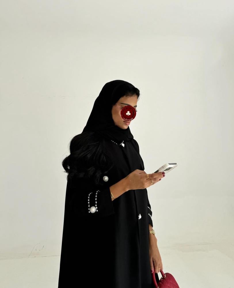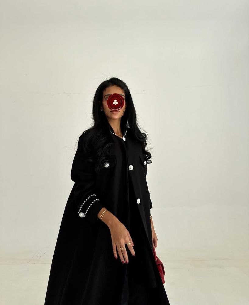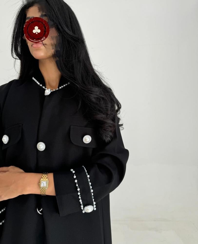 عباية قماش كتان اسود لولو خياطه يدويه في الرقبه والاكمام ، قصة كلوش ، ازرار لولو ، طرحه ساده .