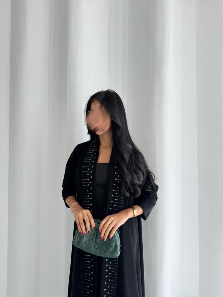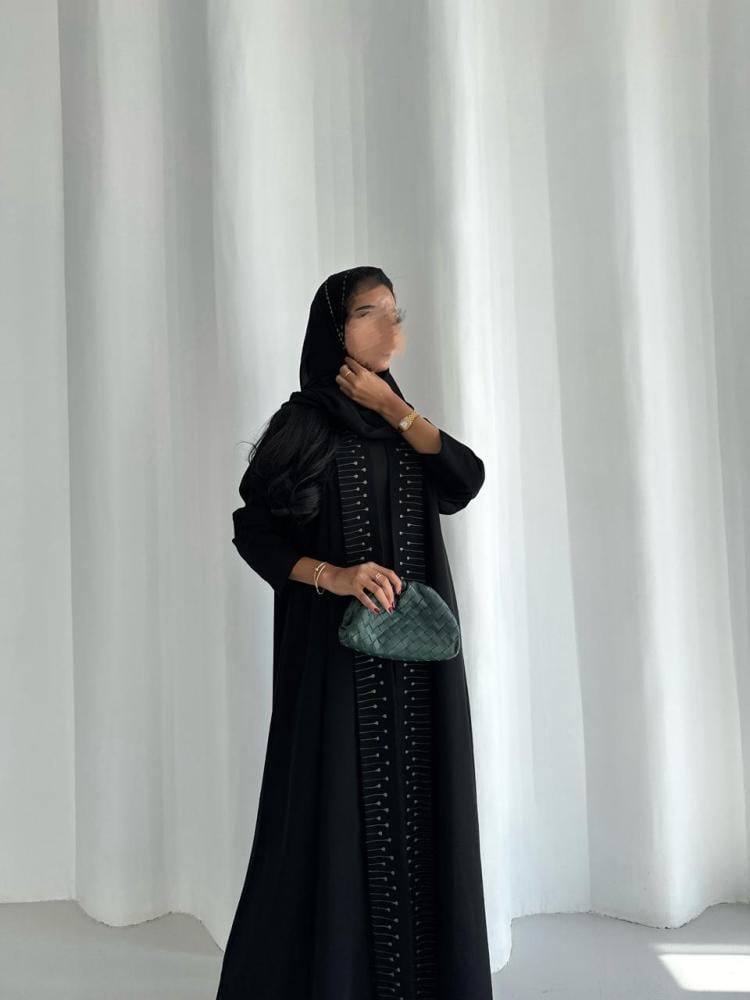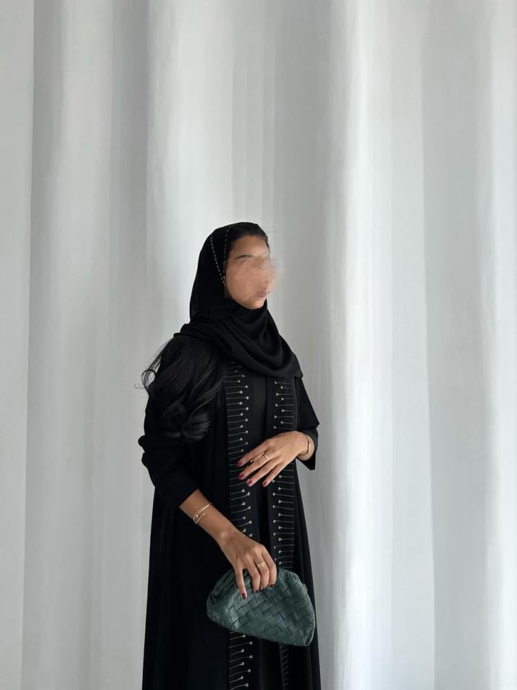 عبايـة قماش كريب اسود سواد فاحم ، تطريز من الامام ، طرحه اسود تطريز طرف ، القصة كلوش