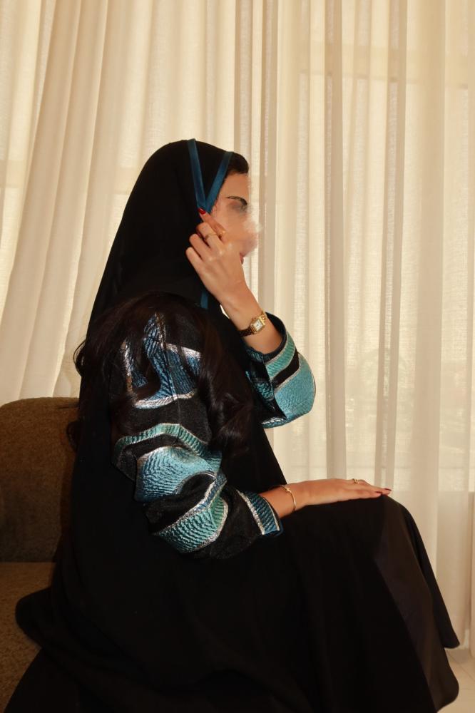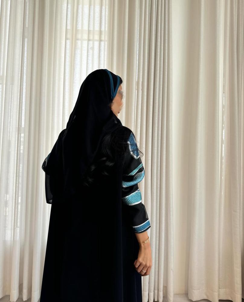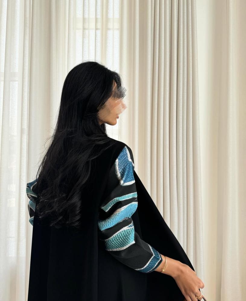 عبايـة قماش كريب اسود سواد فاحم ، قماش مستورد تركي مرسم درجات الازرق بأقمشة مختلفه، طرحه تطريز طرف ، القصة كلوش