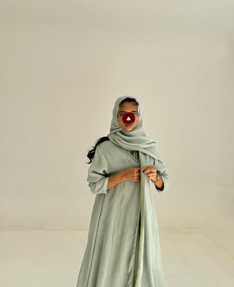 عباية قماش كتان اسود تطريز ابيض ، قصة كلوش ، طرحه اسود تطريز ابيض طرف .
