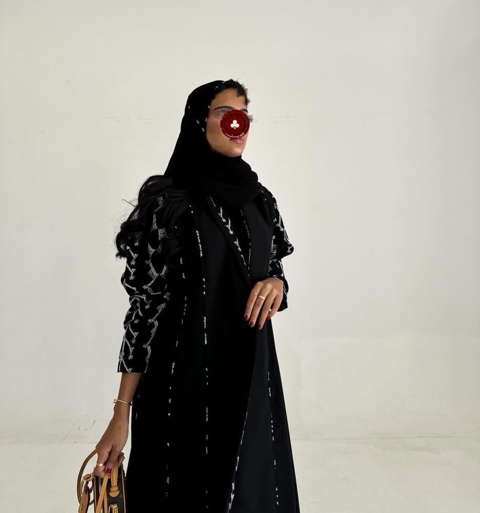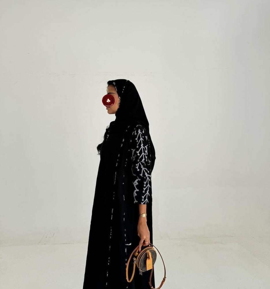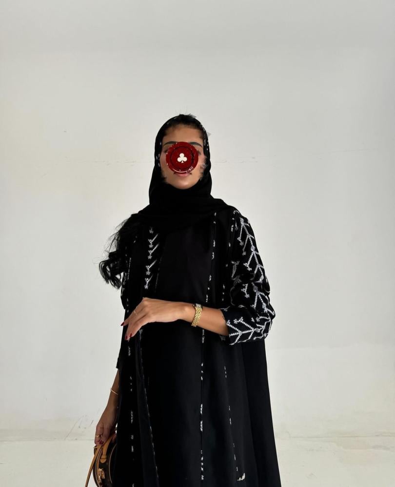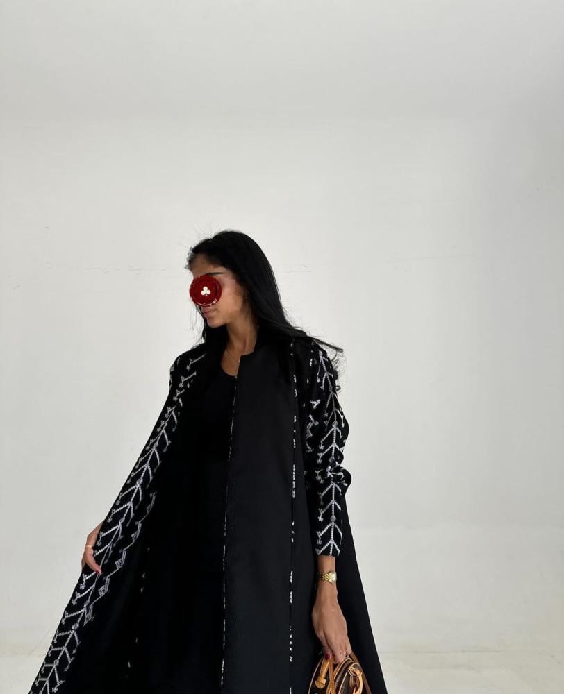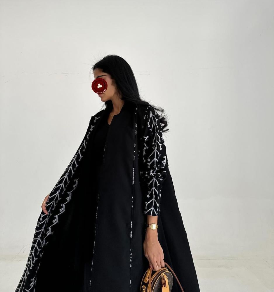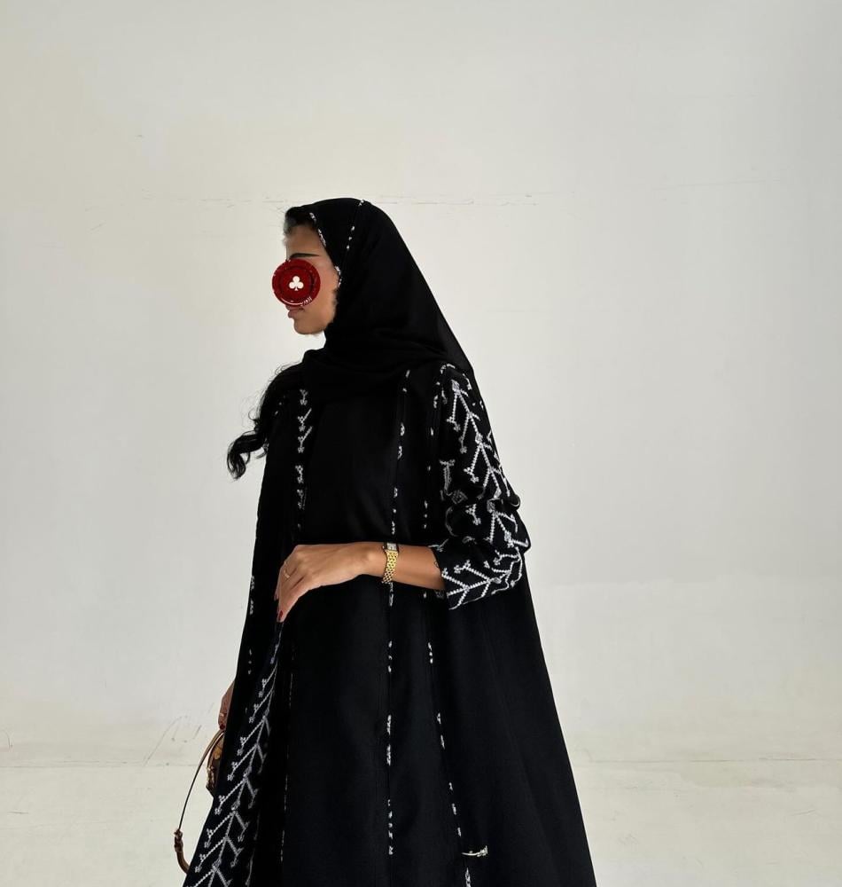 عباية قماش كتان اسود تطريز ابيض ، قصة كلوش ، طرحه اسود تطريز ابيض طرف .