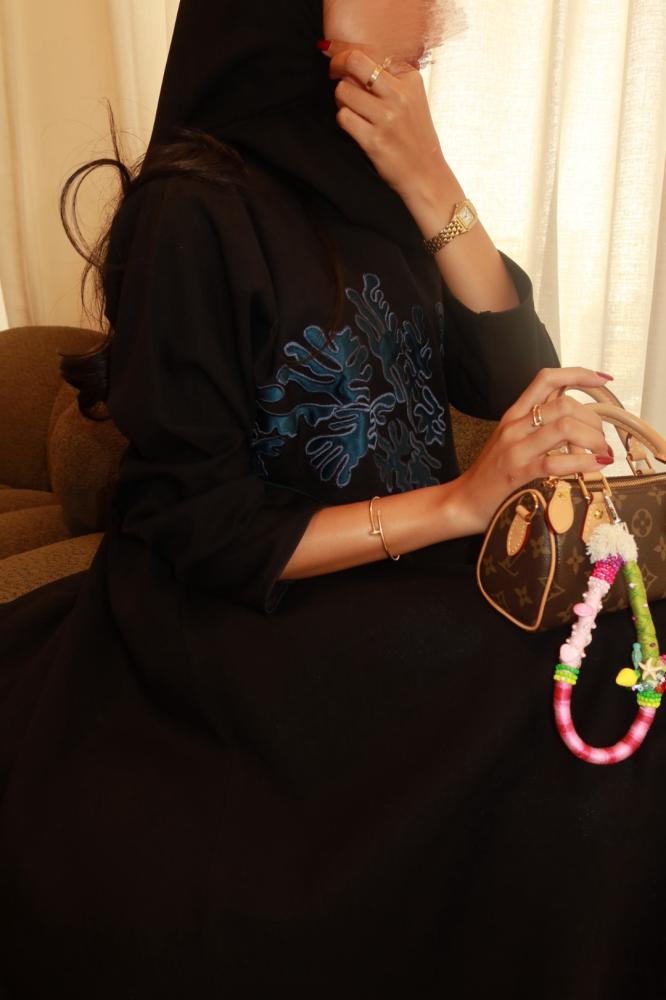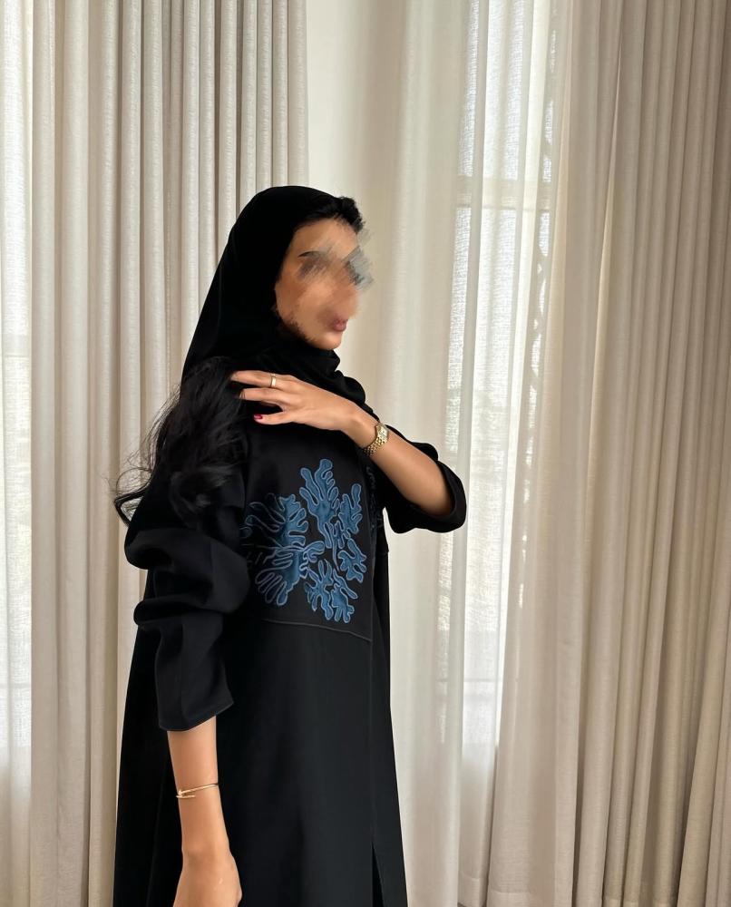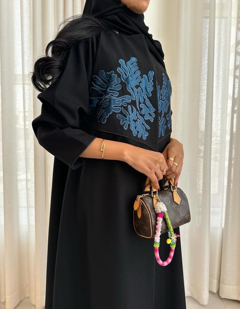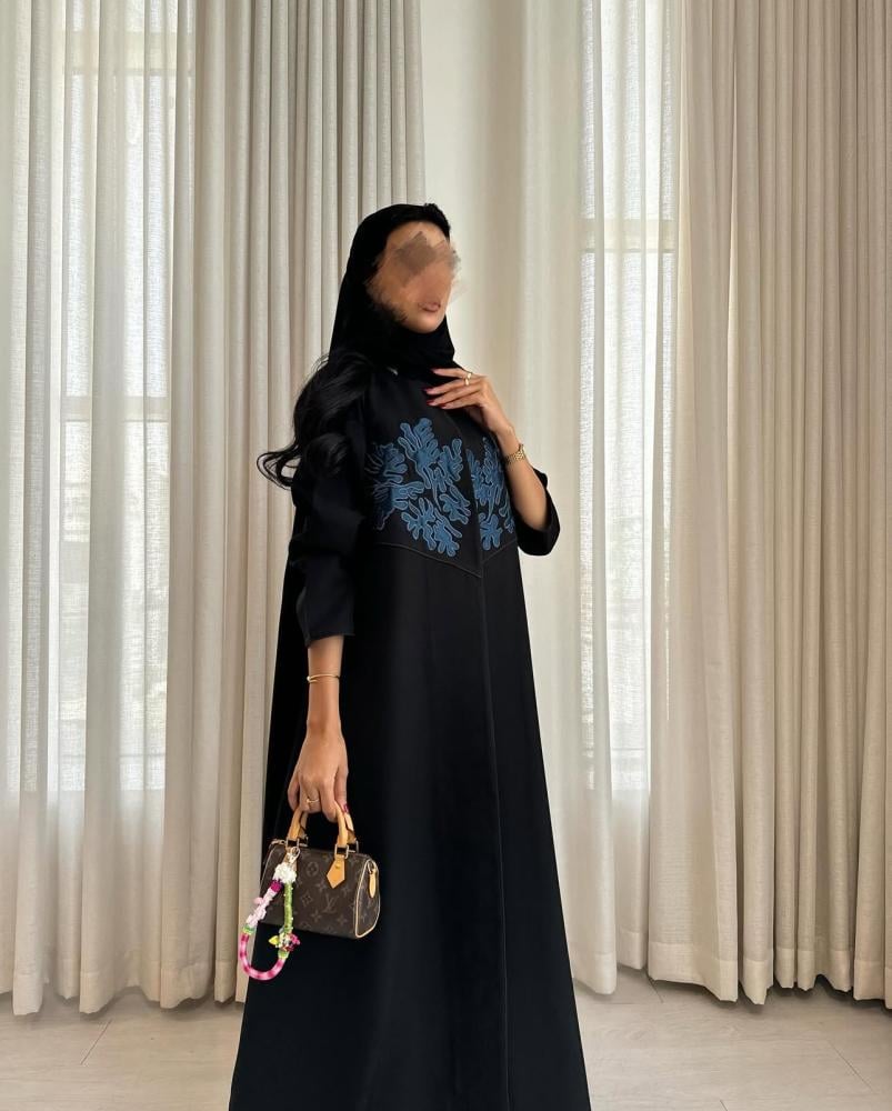 عبايـة قماش كتان اسود ، مطرز قماش تطريز يدوي ، مزينه بقيطان اطراف العبايه ، طرحه اسود تطريز زاوية ، القصة كلوش