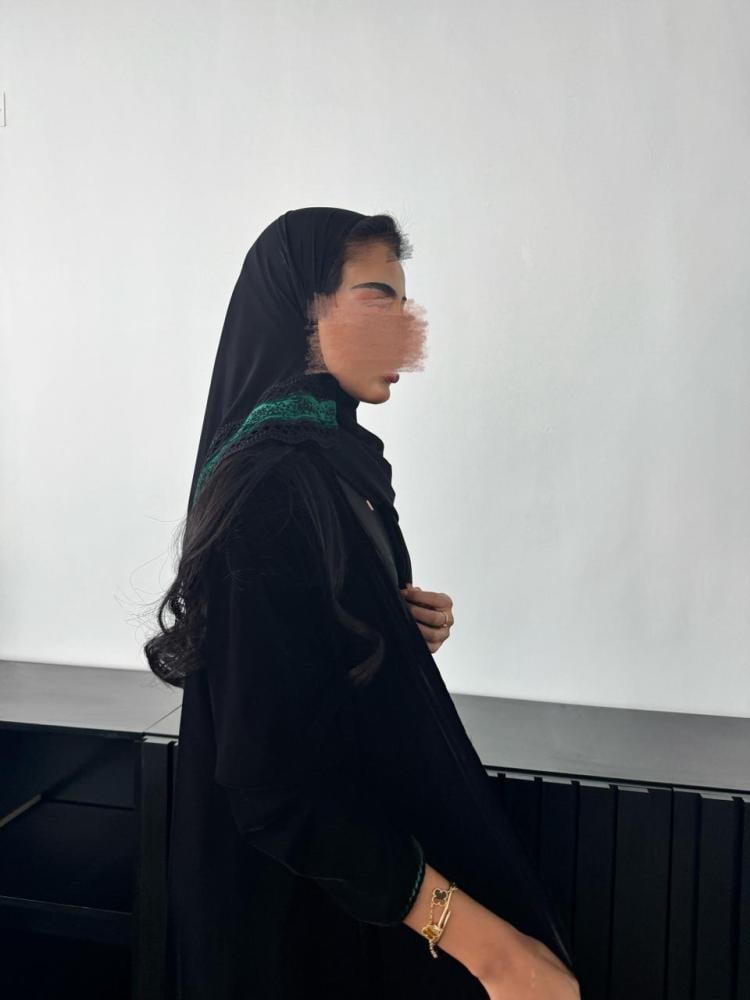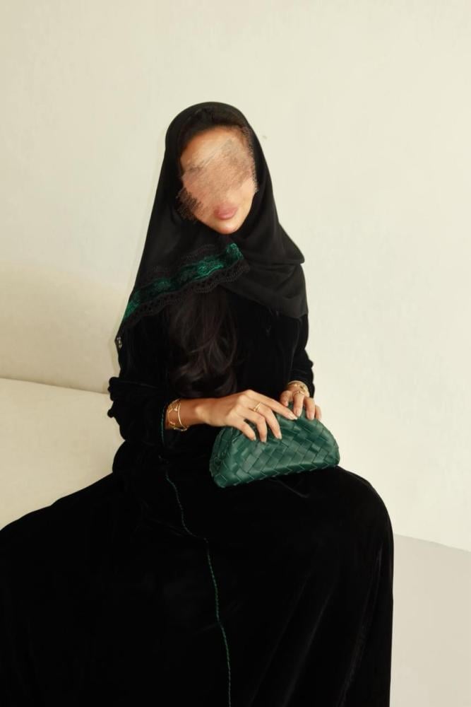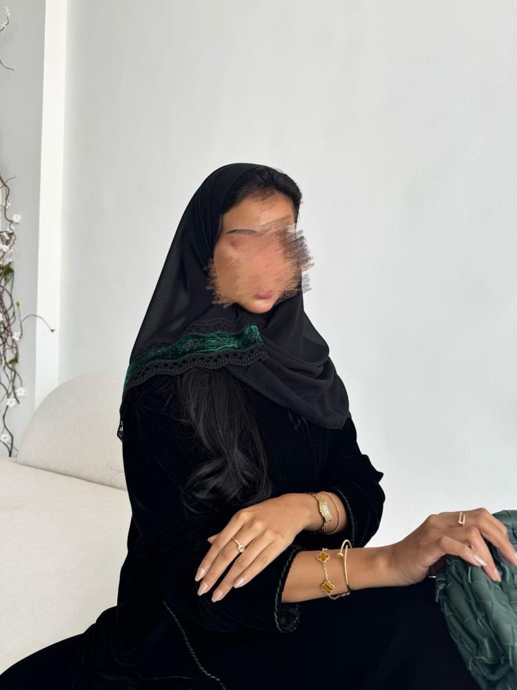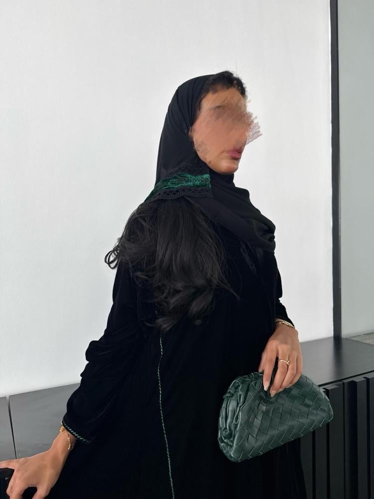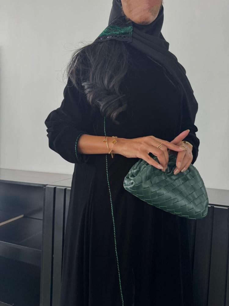 عباية قماش مخمل كوري اسود ، تطريز اخضر ، القصة كلوش ، طرحه طرف دانتيل ومخمل تطريز فرنسي