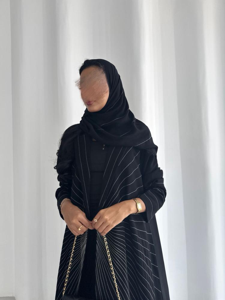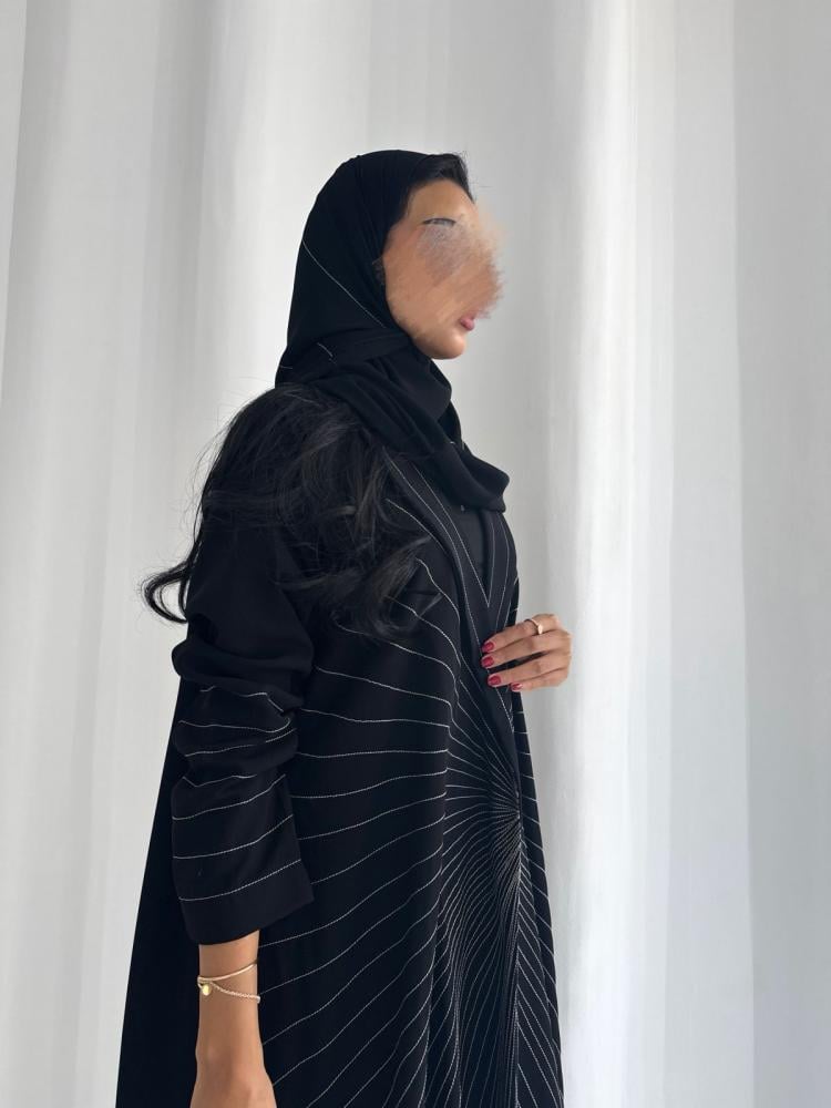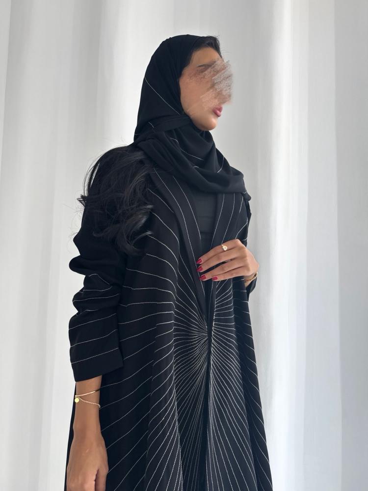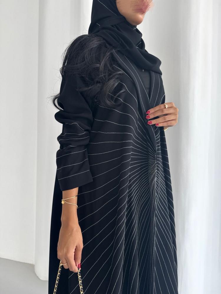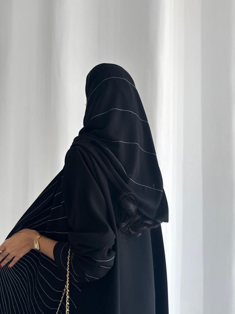 عبايـة بليزر قماش كريب سواد فاحم ، تطريز ابيض، القصة كلوش ، طرحة تطريز ابيض خطوط بالكامل